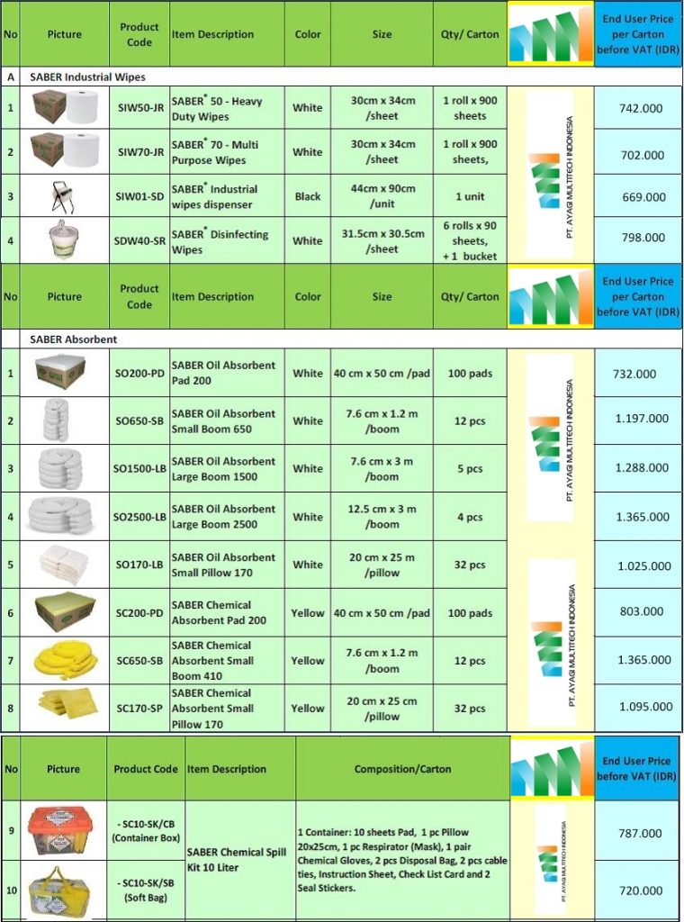 PRODUK : SABER*50 HEAVY DUTY WIPES, SABER*70 MULTI PURPOSE WIPES, OIL ABSORBENT SO200-PD, OIL ABSORBENT SMALL BOOM SO650SB, OIL ABSORBENT LARGE BOOM SO1500SB, CHEMICAL ABSORBENT SC200-PD, AND OTHERS